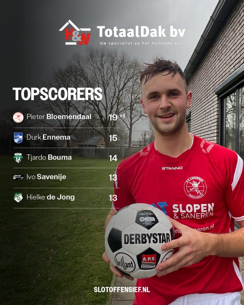 De topscorer van de eerste seizoenshelft is bekend. Het is- en blijft Pieter Bloemendaal van v.v. Langweer. De ploeg van Bloemendaal speelde gister de wedstrijd uit die eerder was gestaakt (3-3). In het restant wist Bloemendaal opnieuw te scoren en zo de winnende 3-4 te maken. Hij eindigt de eerste seizoenshelft op maar liefst 19 goals.