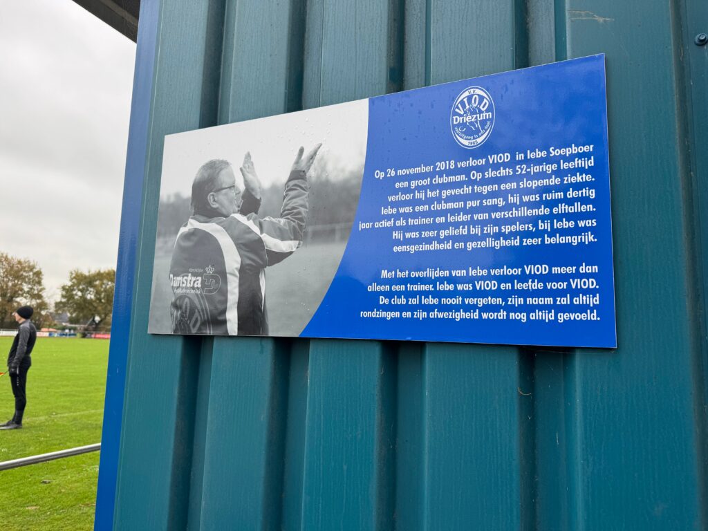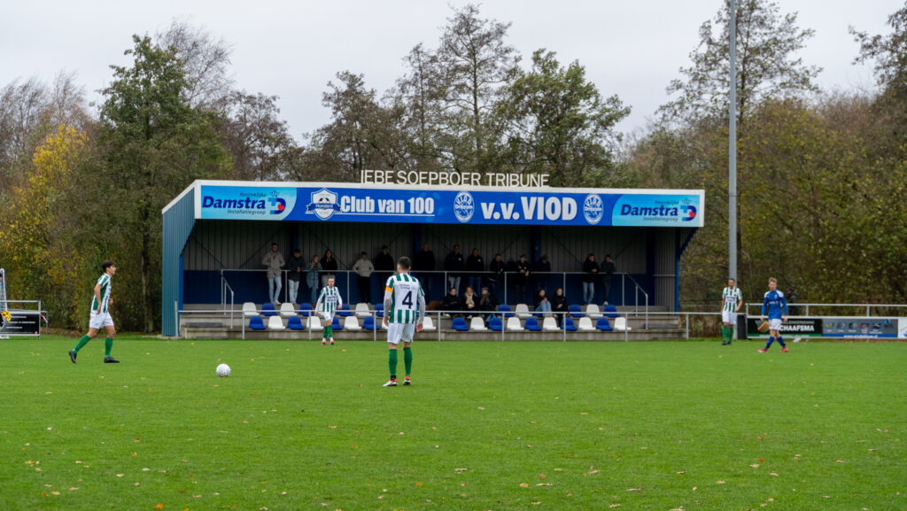 Wat naast de keurige grasmat ook meteen opvalt is de strakke tribune aan de overkant. De Iebe Soepboer tribune. Wanneer we de tribune naderen zien we daar een bordje hangen met meer uitleg. ‘‘Iebe was een clubman pur sang. Hij was ruim 30 jaar actief als trainer en leider van verschillende elftallen. Hij was zeer geliefd bij zijn spelers, bij Iebe was eensgezindheid en gezelligheid zeer belangrijk.” Een mooie ode van VIOD richting deze clubman.