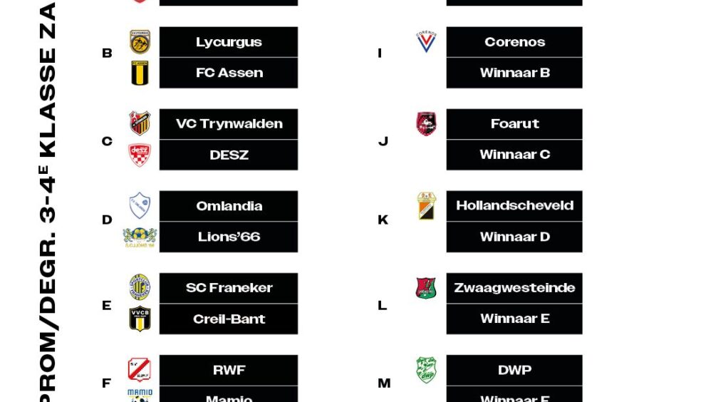 De virtuele nacompetitie in de 3e/4e klasse zaterdag! Op 31 mei worden zeven spannende eerste ronde-duels gespeeld. Van HSC Lions’66 tot SV Haulerwijk, iedereen aast op promotie – of vecht tegen degradatie.