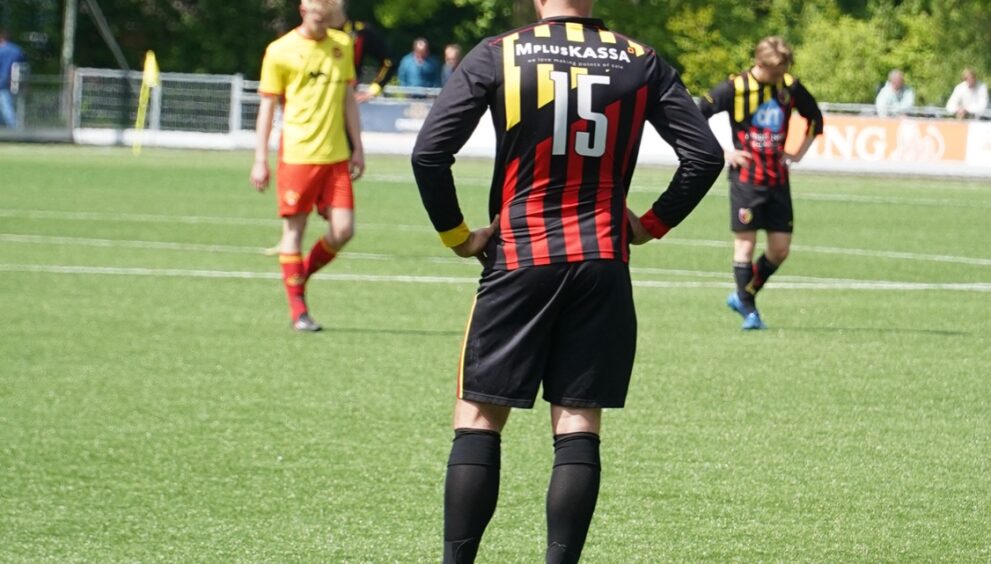 Het is 16 graden met een stevige wind, scheidsrechter Rene Vree Egberts blaast op zijn fluitje voor een drinkpauze.