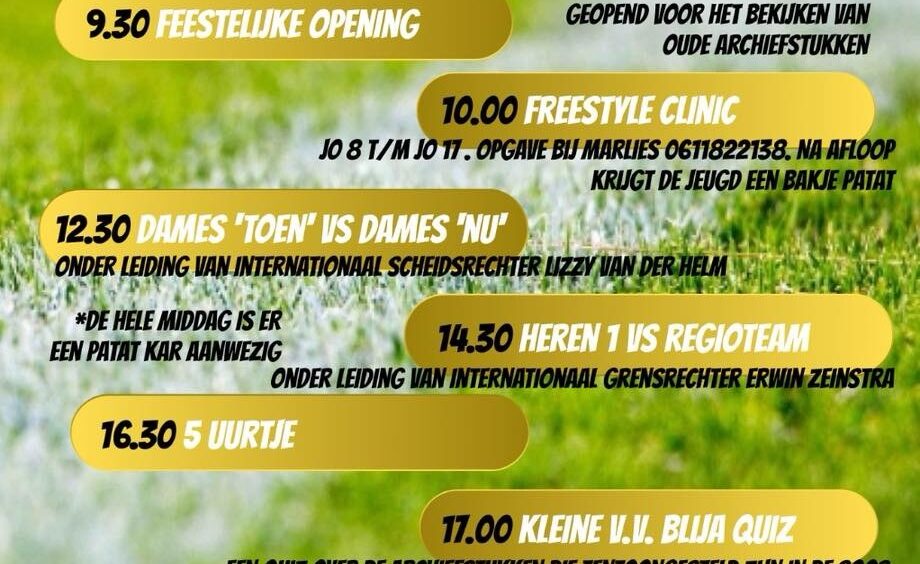 Gedurende de dag is er mogelijkheid om oude archiefstukken te bewonderen. De oplettende kijker heeft, net voordat het verzorgde buffet van start gaat, de mogelijkheid om de kennis te laten testen middels een korte pub quiz. ‘s Avonds verwelkomen wij topspreker Foppe de Haan met zijn unieke en humoristische verhalen en inzichten. Gasten vragen wij een donatie voor het Foppe Fonds zodat Foppe de Haan met een mooi bedrag naar huis mag gaan. Het feest zullen we gezamenlijk afsluiten met een DJ. Wees 31 mei welkom op het sportcomplex van V.V. Blija!