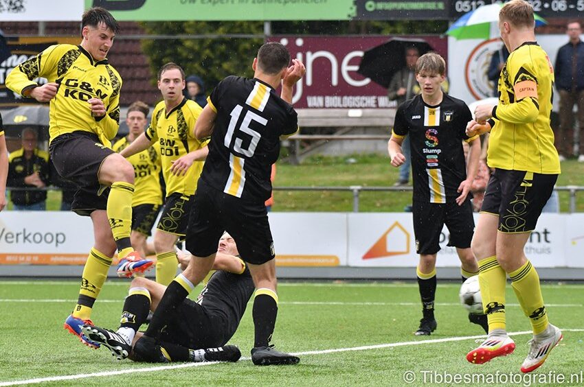 Bij de foto: Thimo Bouma (later met rood van het veld) scoort de gelijkmaker voor ONT. Janco van der Veen, Wilco Berghoef en Tom Allema zien het gebeuren. Foto Tibbesma Fotografie.