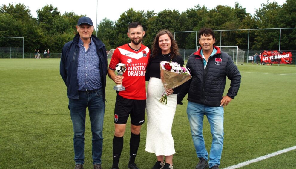 Voorafgaand aan de oefenwedstrijd Broekster Boys – FC Burgum werd Vincent Hoekstra in het zonnetje gezet. Hij werd uitgeroepen tot speler van het seizoen 2024-2025 en ontving een blijvende herinnering namens de supportersvereniging, uitgereikt door Pier Postma.