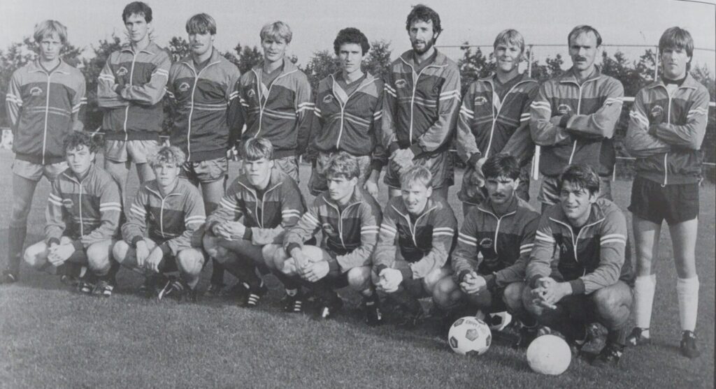 Een vertrouwd beeld bij Broekster Boys aan het einde van de jaren ’80: Pier Sienema in de dug-out. Van links naar rechts: Jan Schulting, Jouke Faber, Pier Sienema, Sjoerd Jan Eppinga en Sipke van der Meulen. Verzorger Jan Klaver staat in de startblokken om een blessure te verzorgen.