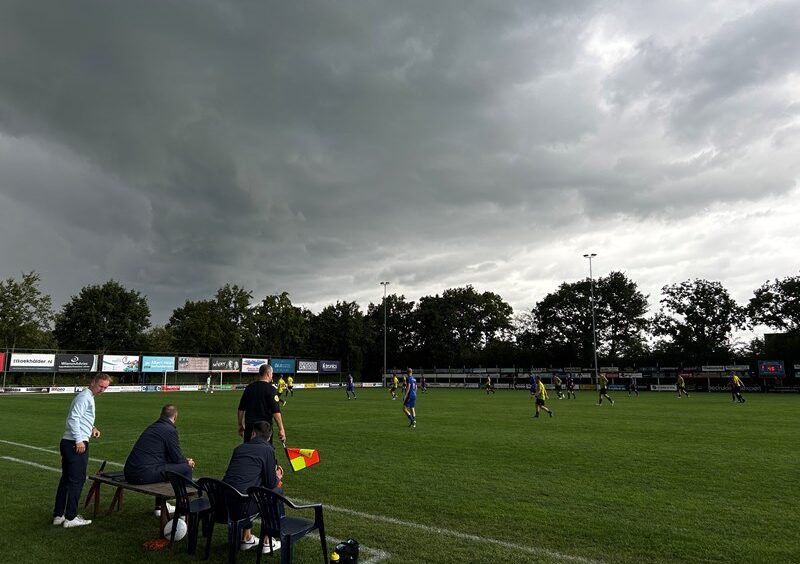 Tijd voor de rust, de paraplu’s komen tevoorschijn, want donkere wolken pakken zich samen boven ’t Ketting, krijgen we op het veld ook een donderslag bij heldere hemel, of is er in de eerste helft al genoeg geflitst?