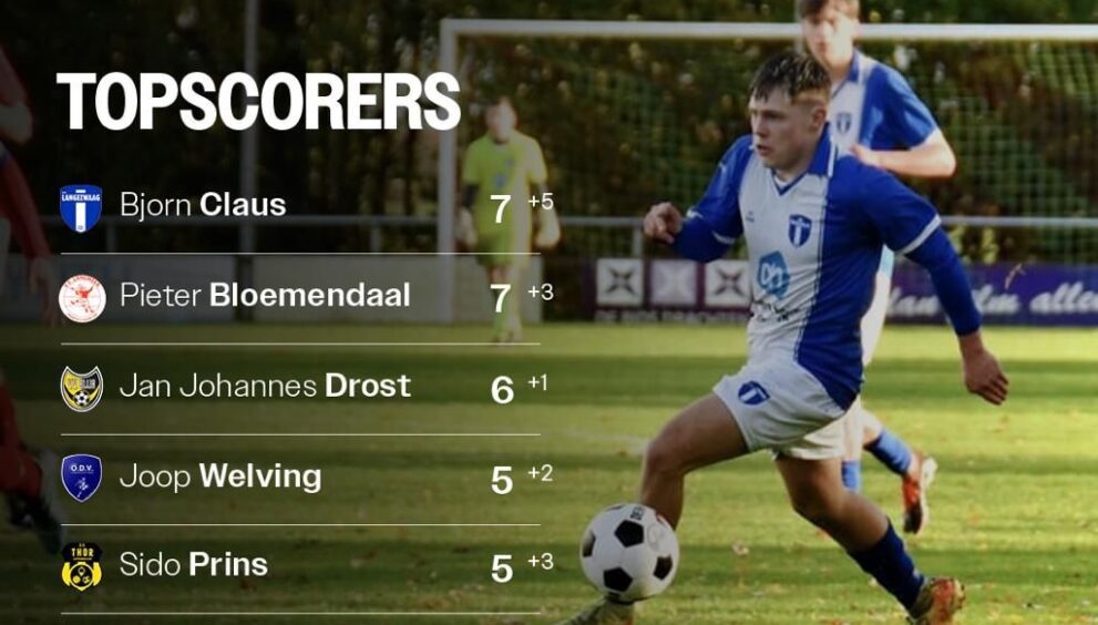 Ook Pieter Bloemendaal liet zich gelden en scoorde drie keer in de 5-2 overwinning van VV Langweer op VV Wispolia. Daarmee komt ook hij op zeven doelpunten en staat hij samen met Claus bovenaan de lijst.