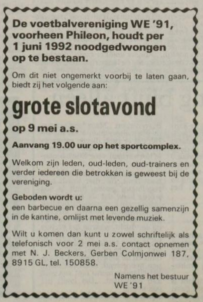 Tevergeefs probeert WE’91 – voorheen Phileon – in het seizoen 1991/1992 een speelveld te verkrijgen. Als dat niet lukt verschijnt in april 1992 deze advertentie in de krant.