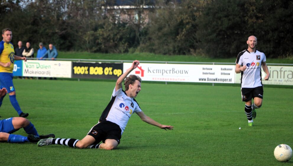 SDS deed er alles aan om de winst binnen te halen, met de wind in de rug, maar echte grote kansen zoals voor de rust bleven uit. Er waren een paar gevaarlijke momenten uit corners en Ate kreeg een beste kans na een voorzet van Lourens, maar ook die verdween niet in de goal. Toch was het uiteindelijk de ‘Red Bull’ die SDS naar de winst kopte in de blessuretijd. Vorige week liep hij tegen de keeper van NOK aan en was zijn wedstrijd na twintig minuten voorbij. Op zondag, maandag en dinsdag kon hij zijn sokken niet zelfstandig aankrijgen en op donderdag trainde hij bijna compleet ingetaped. Hij mocht niet gemasseerd worden, maar dit verhaal kreeg toch een ‘happy end’. De prachtige, harde en indraaiende corner was van Pieter Sijtsma en wie anders dan Ate kopte steenhard binnen na ongeveer 92 minuten.