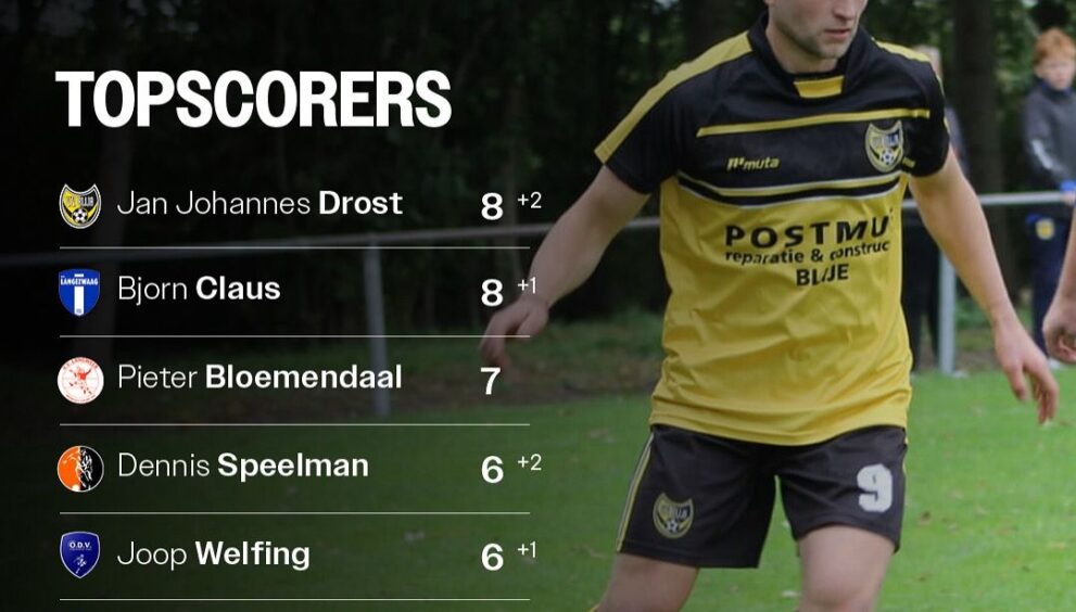 Voor VV Langweer werd het een pijnlijke middag: een 8-0 nederlaag tegen Blauw Rood ’20. Toch behoudt Pieter Bloemendaal zijn tweede plaats op de lijst met zeven doelpunten. De aanvaller blijft dus in het spoor van de koplopers, ondanks de tegenvaller in Bolsward.
