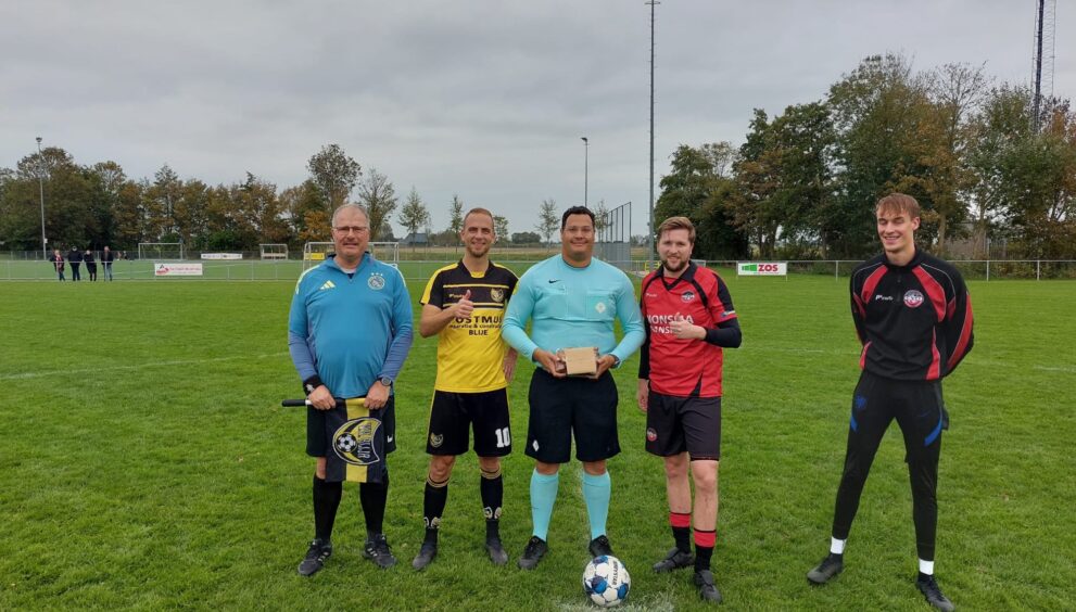 Leidsman Rob de Lau krijgt voorafgaand aan het duel een vleespakket van aanvoerder Johannes de Graaf. Dit als dank voor zijn wekelijkse inzet als scheidsrechter en ook grensrechter bij het eerste elftal. We zijn als V.V. Blija trots en blij met de inzet van onze vrijwilligers!