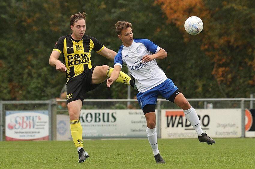 Bij de foto, Wilco Berghoef, hij scoorde de 1-0 voor ONT, in een duel om de bal. Foto Bennie Annema, SC Kootstertille.