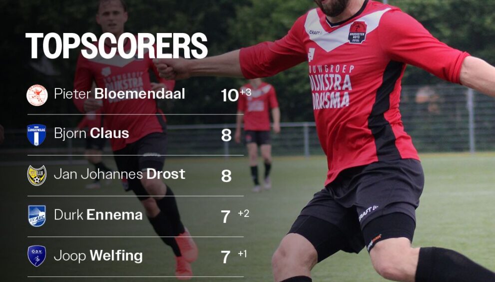 Achter Bloemendaal volgen Bjorn Claus en Jan Johannes Drost, die met elk acht doelpunten de gedeelde tweede plek bezetten. Beide spelers kwamen dit weekend echter niet tot scoren. Claus speelde met VV Langezwaag tegen Blauw Rood 20 en verloor met 0-1. Drost speelde met zijn team gelijk tegen CVO: 1-1. Het was de derde keer in de laatste zes ontmoetingen tussen beide ploegen dat het 1-1 werd.
