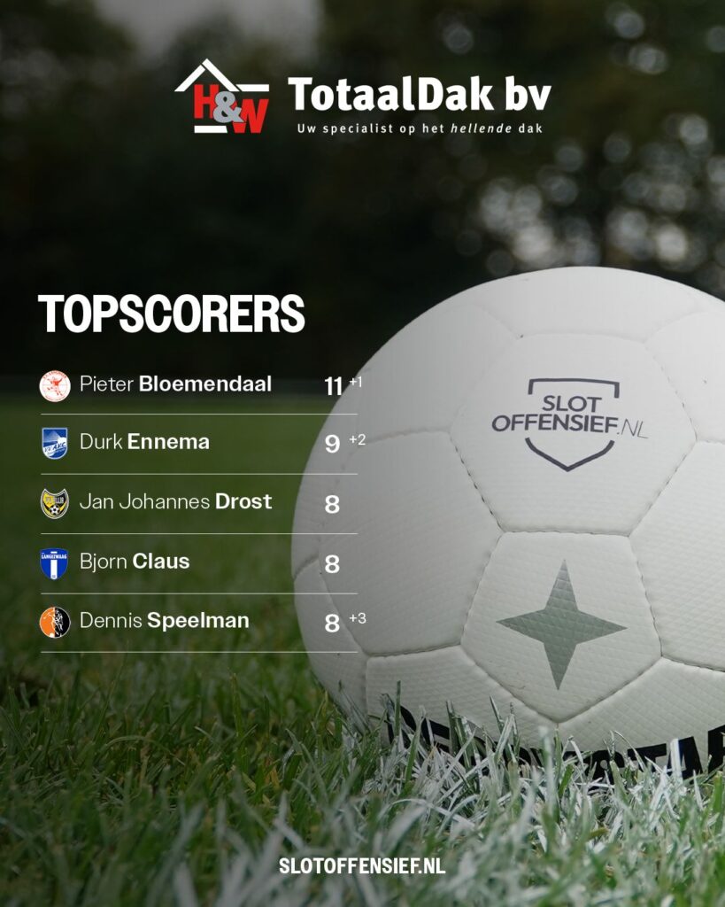 De huidige koploper in de topscorerslijst, Pieter Bloemendaal, deed er nog een schepje bovenop. Hij vond het net met een schitterende treffer tegen Aengwirden, waarmee hij zijn seizoenstotaal op 11 doelpunten bracht.