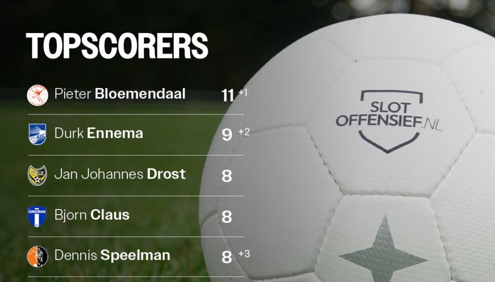 Ook Durk Ennema liet wederom van zich horen. De aanvaller van AVC scoorde twee keer, ditmaal in de wedstrijd tegen GAVC. Zijn dubbelslag leverde AVC geen overwinning op maar persoonlijk stijgt die wel naar plek 2 in de lijst.
