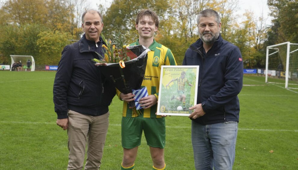 Het bestuur van Harkema-Opeinde huldigde zaterdagmiddag voor de wedstrijd Harkema Opeinde 1-Friese Boys 1 selectiespeler Twan Polder. Voor de 21-jarige Harekiet was het alweer de honderdste keer dat hij zijn opwachting maakte in het Harkemaster vlaggenschip. Polder kreeg een bos bloemen, een waardebon en een ingelijst aandenken. De mooiste opbrengst van de middag was er evenwel rond half vijf, toen bleek dat Polder en consorten middels een 1-0 zege weer een nieuwe driepunter bij konden schrijven.