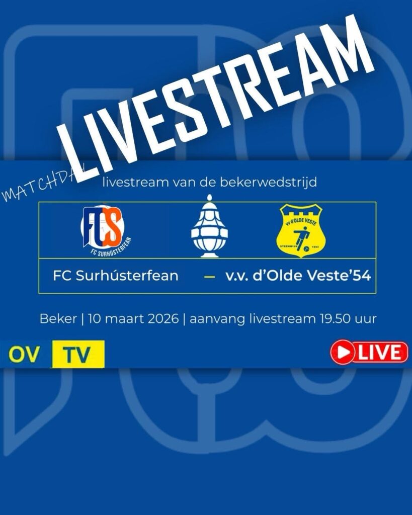 Deze kwartfinale bekerwedstrijd beleef je natuurlijk het liefst gewoon live op het sportpark en niet vanaf de bank. Moet je vanavond werken, ben je niet in de gelegenheid om te komen of kun je er om een andere reden niet bij zijn? Dan kun je de wedstrijd volgen via de livestream van Olde Veste TV op YouTube.